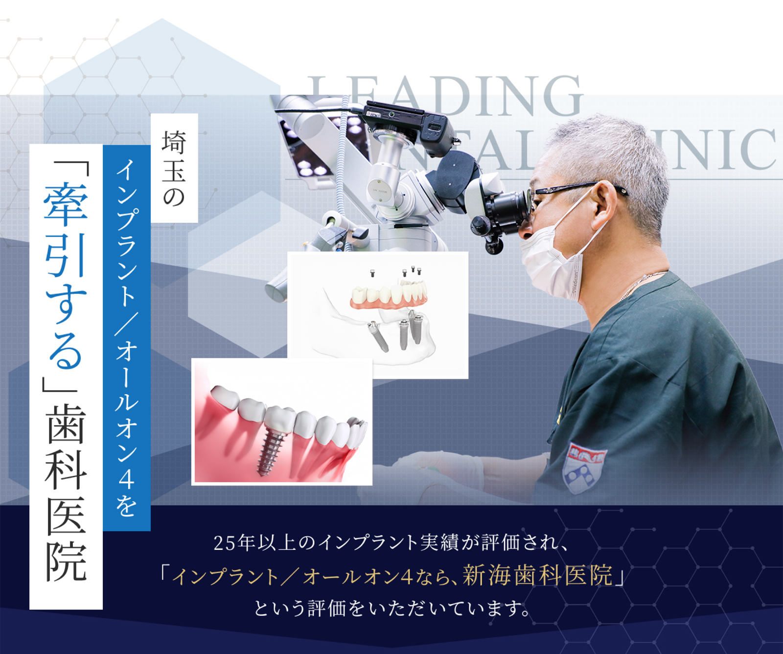 新海歯科医院は、「GOIA JAPANインプラント認定医」「日本口腔インプラント学会認証医」として認定された院長、新海誠のもと、大学病院に匹敵するチーム体制と設備で、最先端のインプラント治療に取り組んでいます。