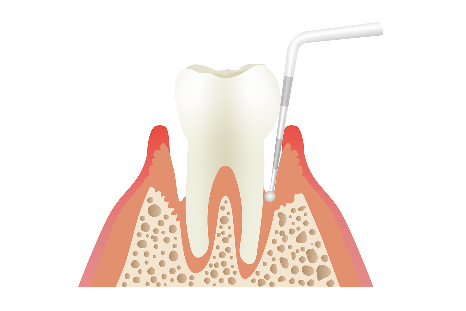 「歯周ポケット」の深さを測ると、歯周病の進行状況がわかります。健康な歯茎の場合、通常ポケットの深さは1〜2mmです。しかし、3mm以上になると歯周病の疑いがあると言えます。